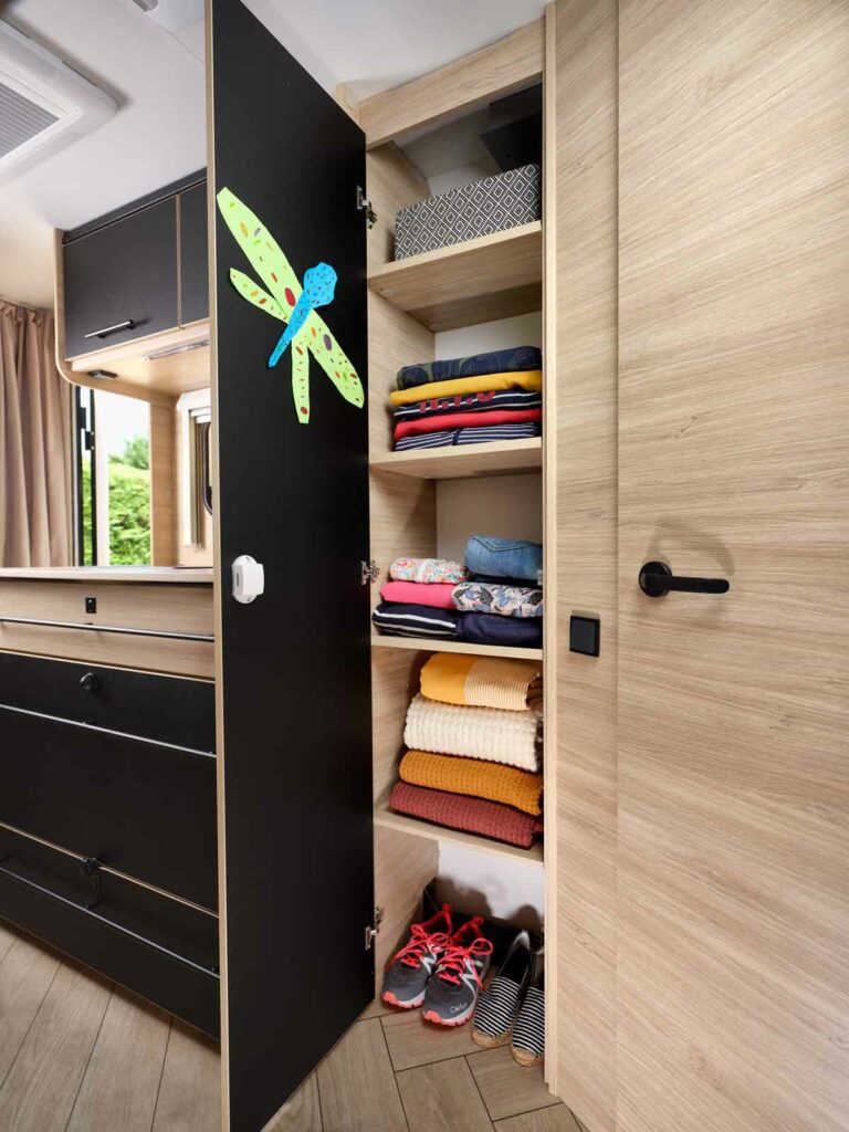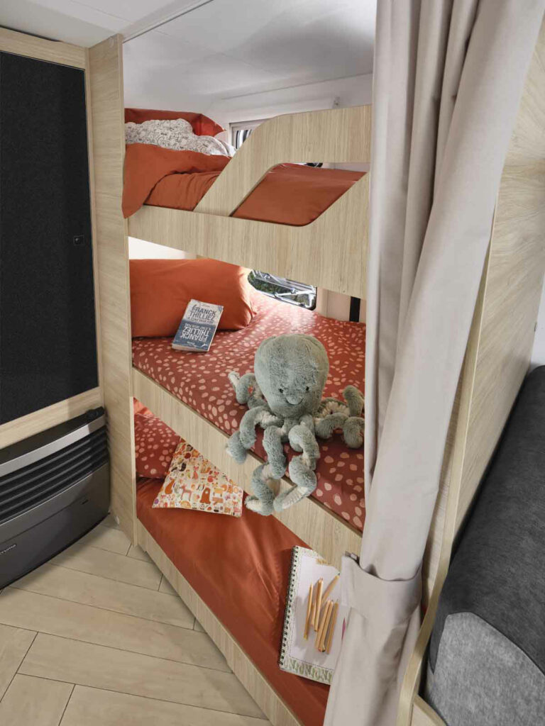 Con sus tres literas en la parte trasera, una cama doble en la parte delantera y un salón espacioso transformable, la 497PE ofrece una configuración ideal para familias numerosas. Cada espacio está bien separado, sin camas enfrentadas, para mayor intimidad y fluidez a bordo. Funcional, bien equipada y diseñada para durar.